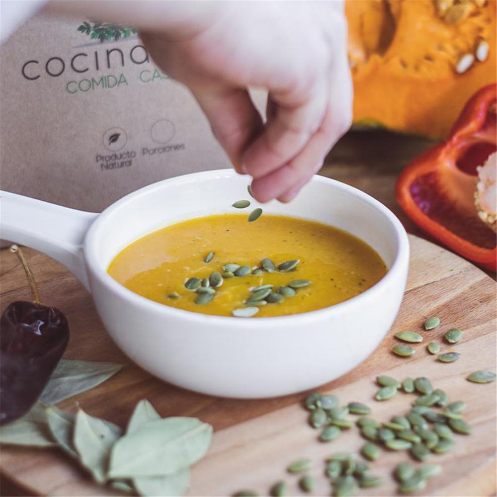 Descripción: Suave crema de zapallo camote ligeramente caramelizados junto a papas y cebollas tiernas atenuado con vino blanco y perfumado con especias hasta lograr la consistencia perfecta para acompaņar una rica cena.