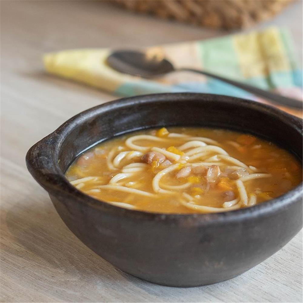 Descripción: Clásica receta preparada con el método tradicional y respetando los sabores auténticos de esta preparación. Cremoso guiso de porotos, zapallos, cebolla, zanahorias y espaguetis.