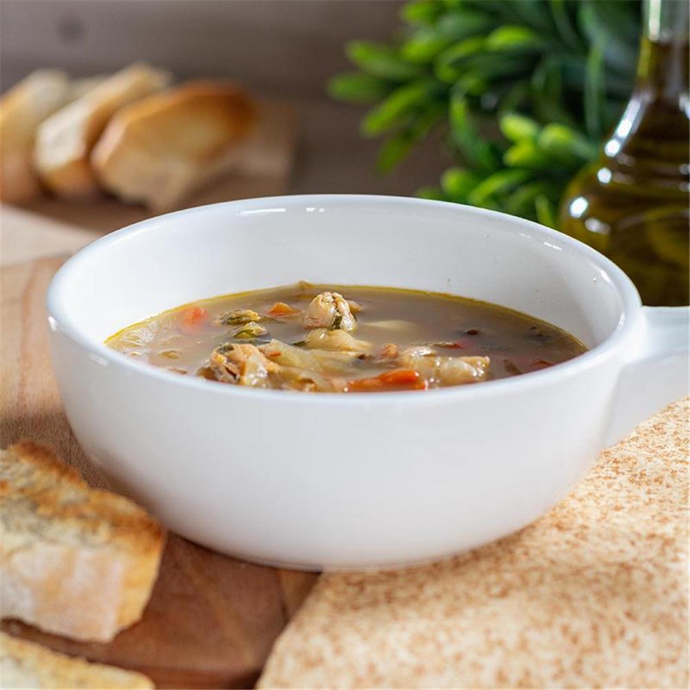 Ingredientes: Mix de mariscos frescos (ostión, calamar, camarón, choritos, pulpo), pimientos rojos, cebolla, limón, vino blanco y fumet de congrio patagónico.