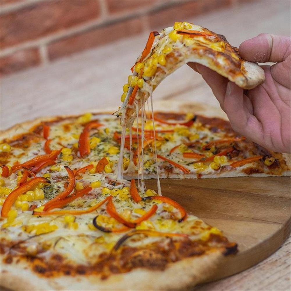 Descripción: Exquisita masa casera de pizza, respetando sus prolongadas fermentaciones para aportar ese intenso aroma y perfecta crocancia al salir del horno. Servida con vegetales, salsa pomodoro y queso mozzarella.