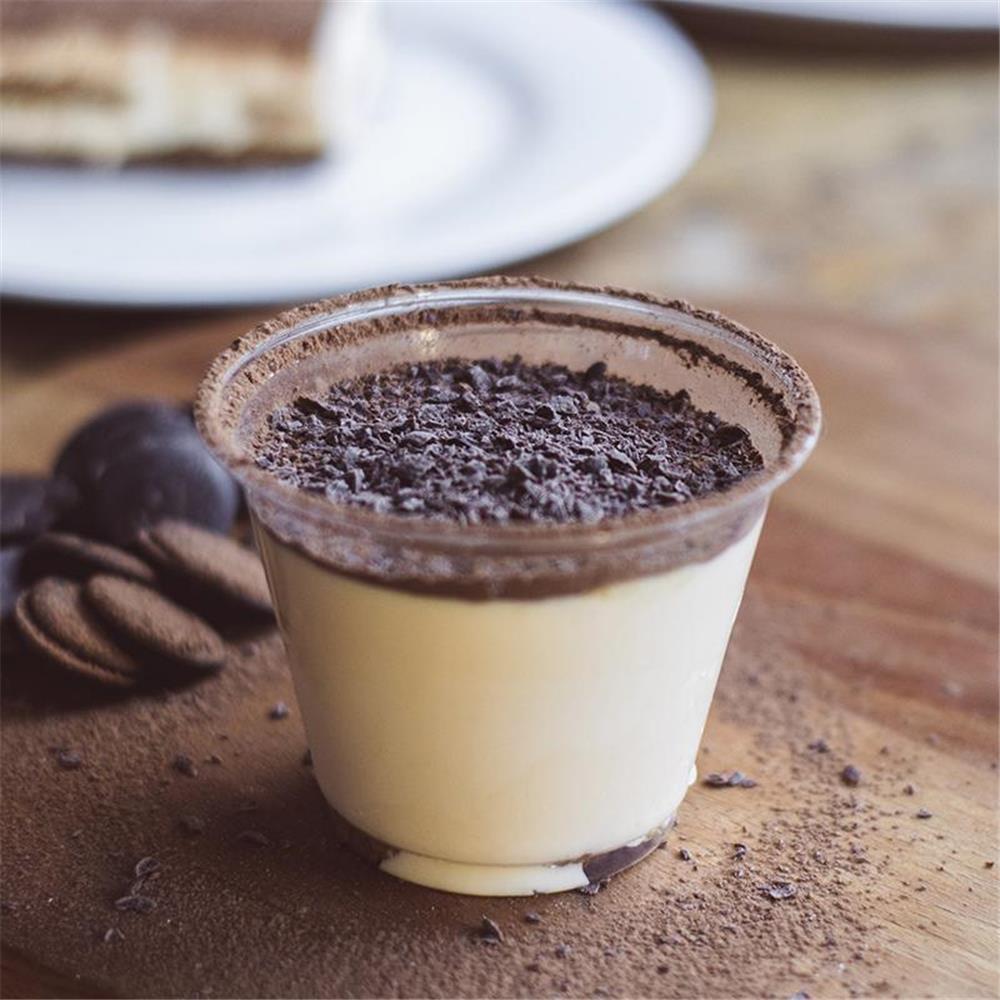 Descripción: Clásica receta italiana con el toque de casa. Suave mezcla de queso crema perfumada con licor de almendras, montado entre galletas de champaña pochadas en café expreso y licor de café, coronado con cacao amargo y chocolate bitter rallado.