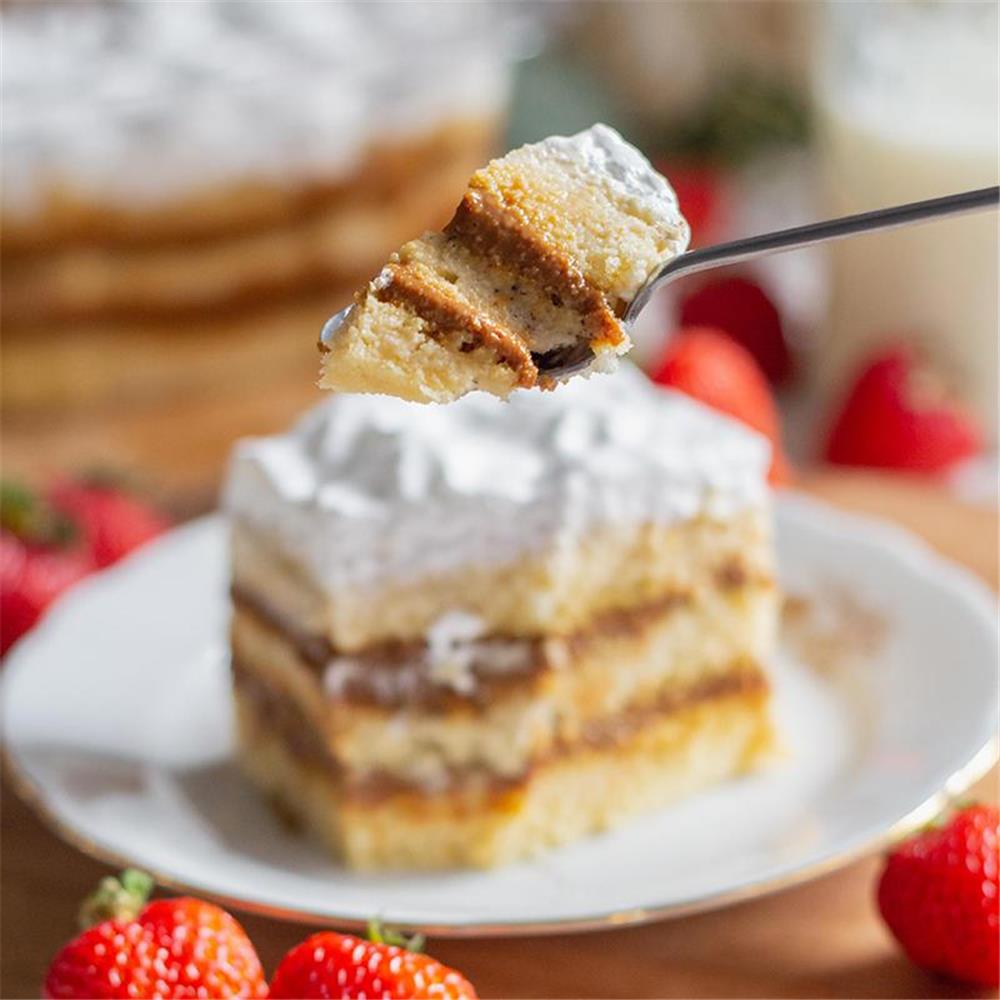 Ingredientes: Remojo de leche (Leche evaporada, leche condensada, crema de leche, ron, esencia de vainilla y canela). Bizcocho (Harina de trigo, azucar, huevo y polvos de hornear). Manjar. Merengue suizo (Huevos y azucar).