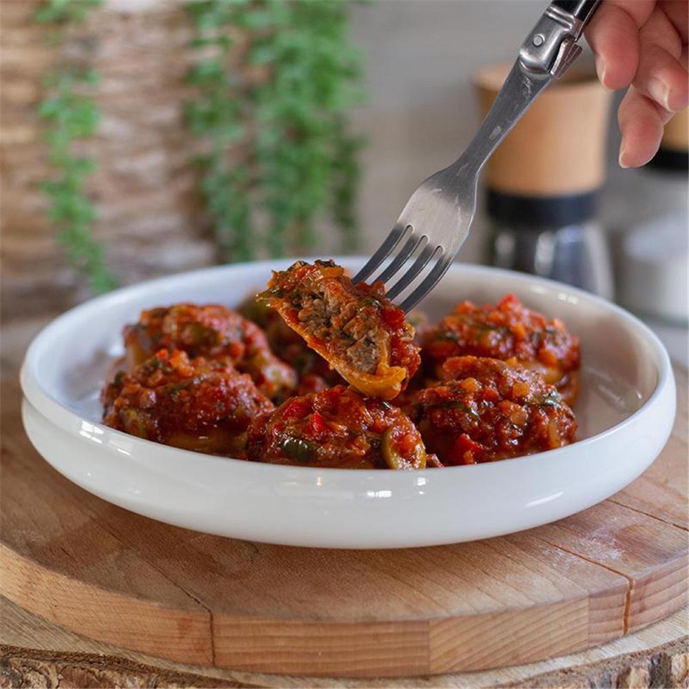 Descripción: Pasta rellena hecha en casa, masa atomatada rellena de mechada de cordero perfumada con hierbas frescas y especies. *Foto referencial, no incluye salsa.