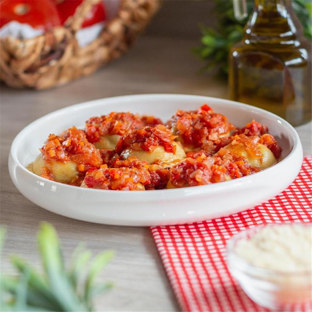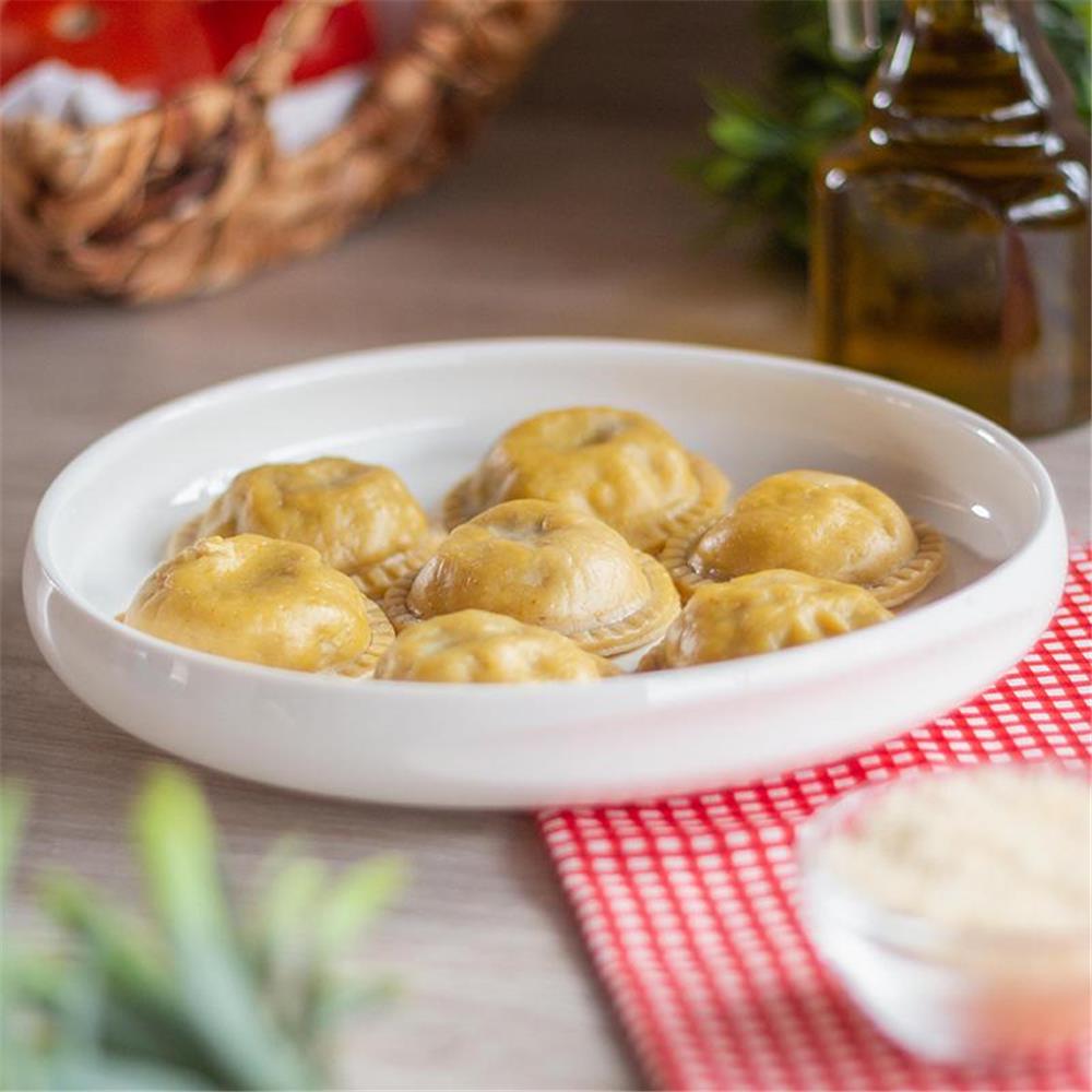 Descripción: Masa casera de pasta tradicional, rellena de mechada de plateada de vacuno al vino tinto aromatizada con hierbas frescas. *Foto referencial, no incluye salsa.